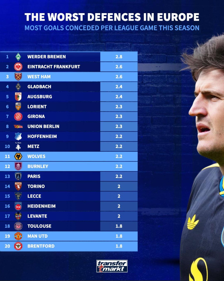 虎扑09月29日讯德转数据统计本赛季至今欧洲五大联赛场均丢球榜,不莱梅场均2.8球第一,曼联场均丢球1.8球。