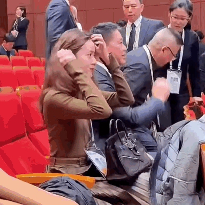 同样是镜头下的"照顾",细节里藏着截然不同的温度。刘强东的搀扶贯穿入场离场全程,章泽天坦然接受时会报以浅笑,两人同步低头看资料、整理衣物的默契,是十年婚姻沉淀的痕迹。但这份自然里也掺着真实的疏离——座位间的空隙、刘强东紧锁的眉头、章泽天下意识后仰的身体,像极了"一边顾工作一边护家人"的职场夫妻日常。